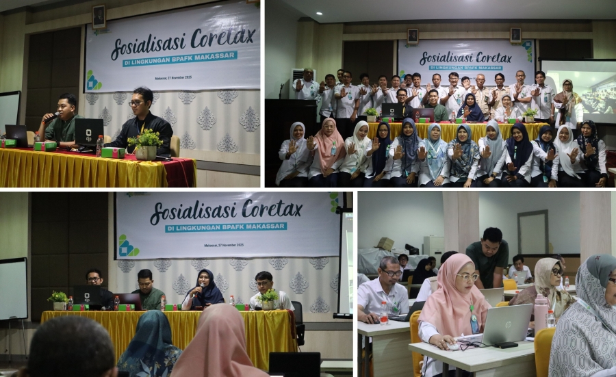 Makassar — Balai Pengamanan Alat dan Fasilitas Kesehatan (BPAFK) Makassar menyelenggarakan Sosialisasi Coretax pada Hari Kamis, 27 November 2025, sebagai langkah meningkatkan pemahaman pegawai terkait pelaporan SPT Tahunan 2025 dan aktivasi akun Coretax. Kegiatan berlangsung di Aula Lantai 1 BPAFK Makassar mulai pukul 09.00 WITA, serta diikuti secara daring melalui zoom meeting oleh pegawai di UPF PAFK Jayapura.